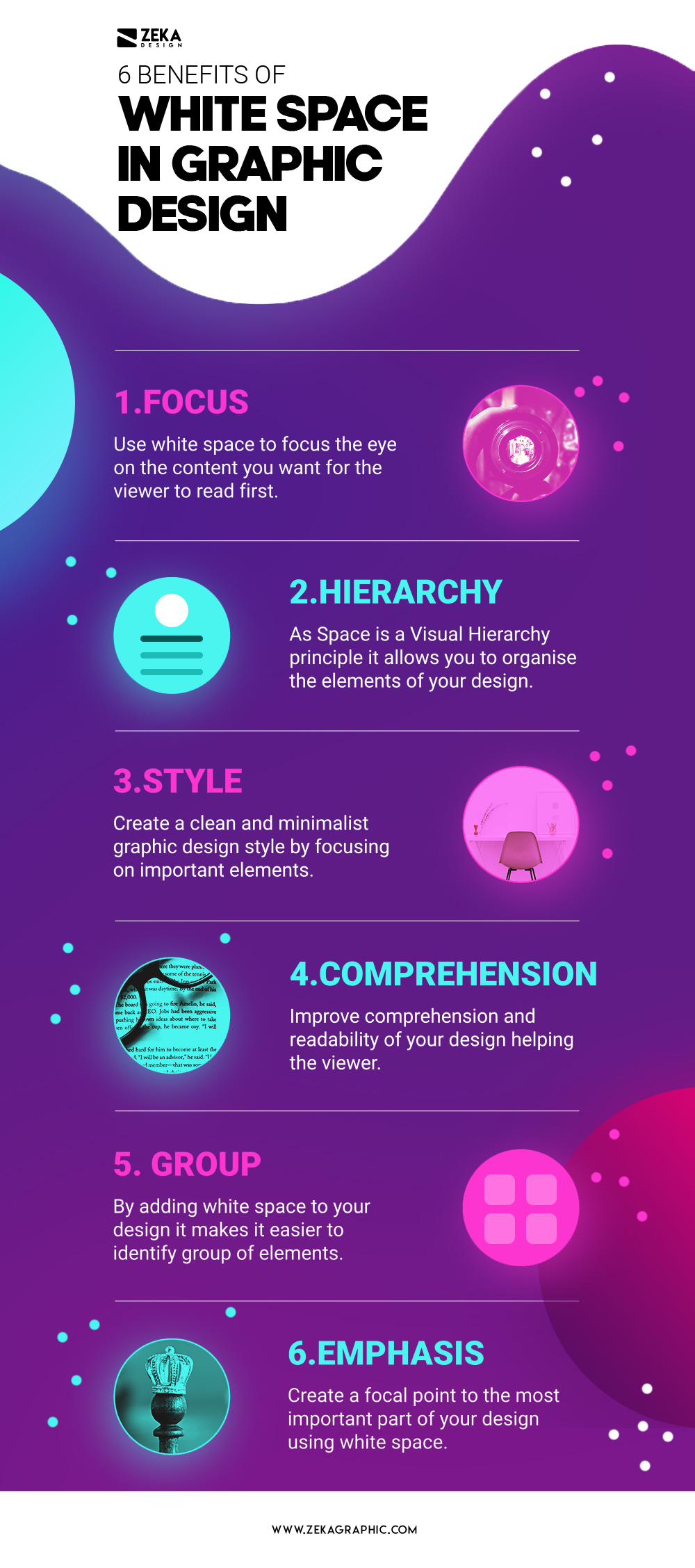 White space is used by designers to create a visual hierarchy among the graphic elements to help the viewer scan the design and easily identify the focal points, by adding white space in your design it also increases the legibility and readability of your text and negative space can help you to create a minimalist design style.